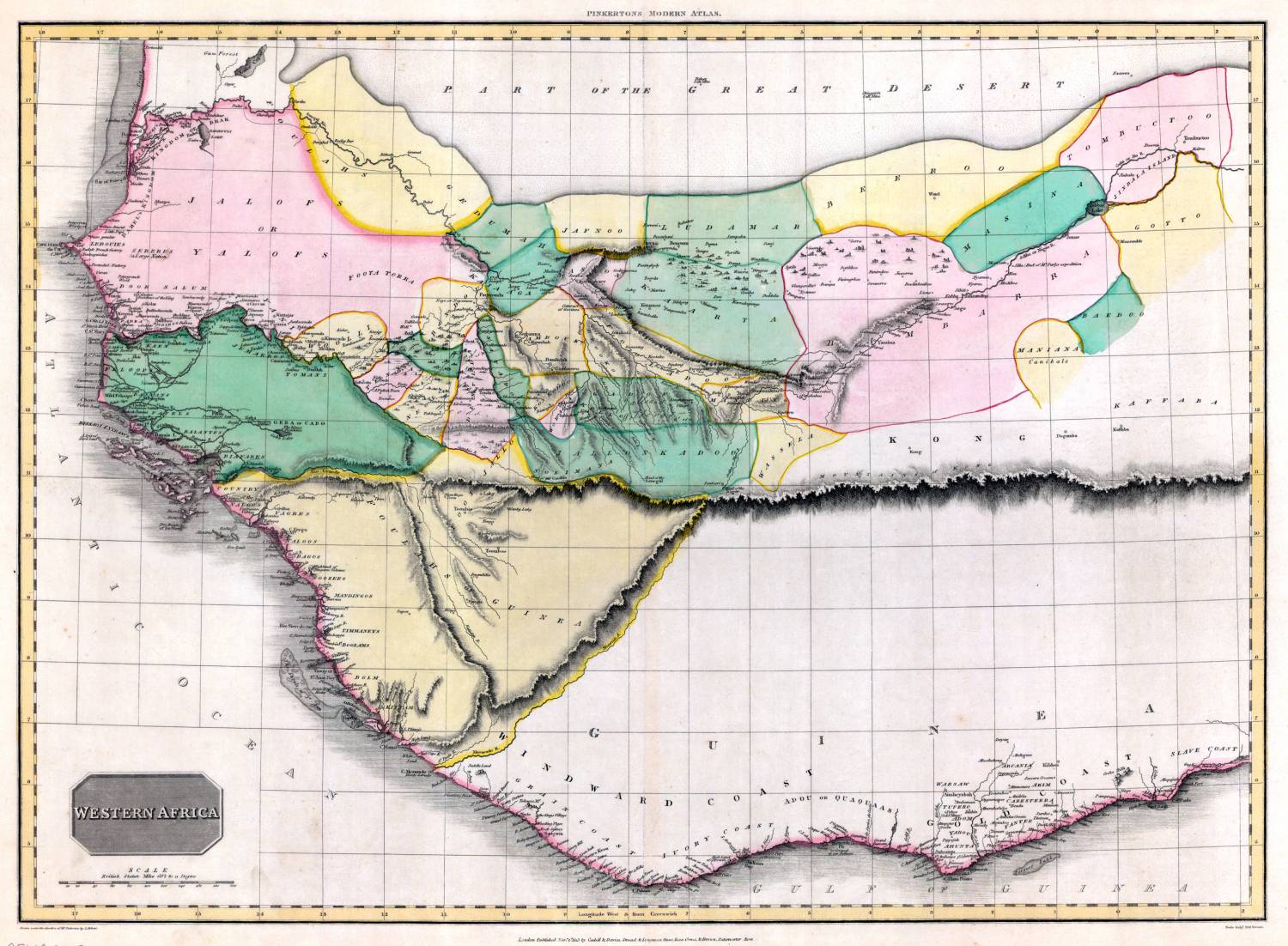 Une autre idée qu'on se fait d'un fleuve, encore : sur flux doit grosso modo être perpendiculaire à la côte, et "descendre" vers elle. Le Nil, le Sénégal correspondent à l'idée. Quand on découvre le Niger, l'amont arrive de l'Ouest, on le croit lié au fleuve Sénégal. Quant à l'aval, il part d'abord vers l'intérieur du continent... au cœur du Sahara ? Puis il prend plein Est pour faire une barre au milieu du continent. On invente même que son cours est bloqué par les mystérieux (et fictifs) Monts de Kong (ça ne vous fait pas penser à un grand singe ?) Pire, il s'égaille dans un gigantesque delta intérieur, labyrinthe d'eau et de végétation, jusqu'à Tombouctou, ce qui fait longtemps dire que le fleuve disparaît dans la terre (il y perd quand même 50% du volume de ses eaux !).